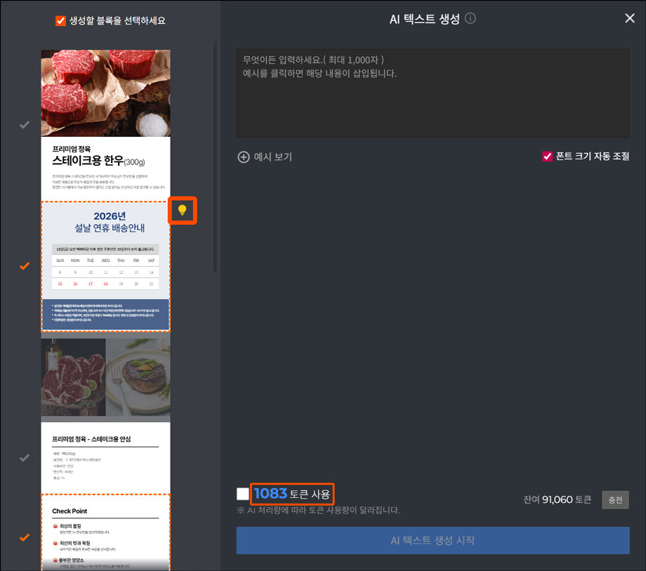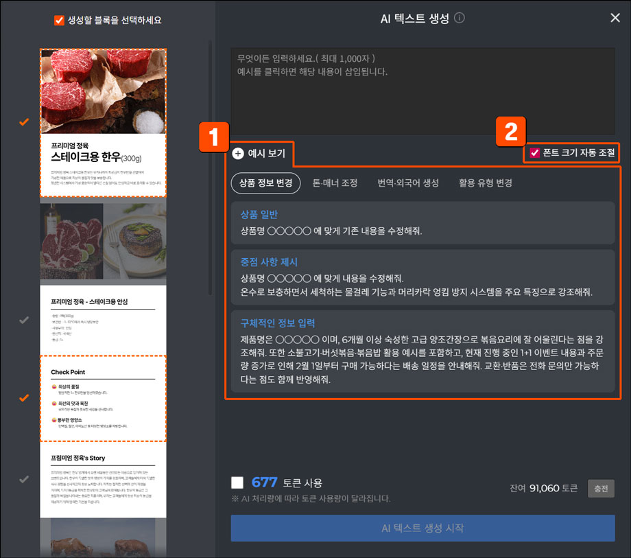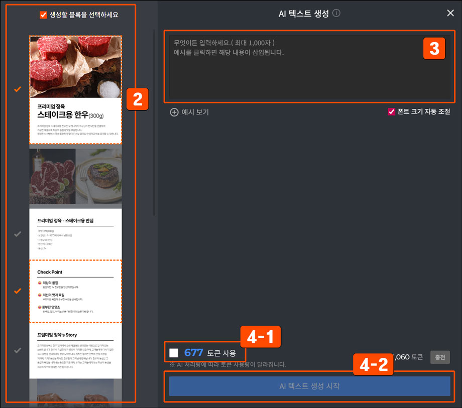 AI 텍스트 사용 시, AI 상품상세 이용권 1회 또는 1,000 토큰이 고정 차감됩니다.