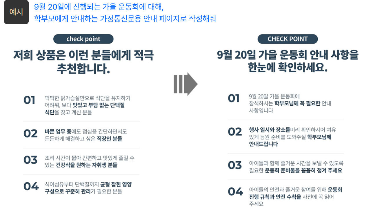 - 구체적인 요구사항이 없는 러프한 프롬프트의 경우, AI는 디자인 원문의 텍스트를 참고하여 작성 방향을 판단합니다.